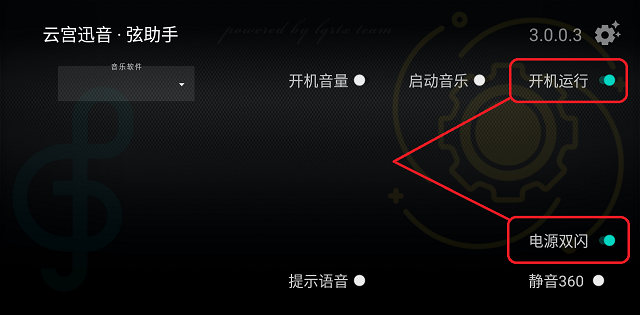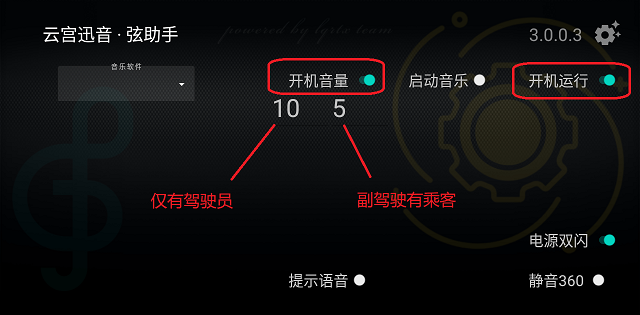 打开弦助手的“开机音量”选项,分别设置2组音量值: